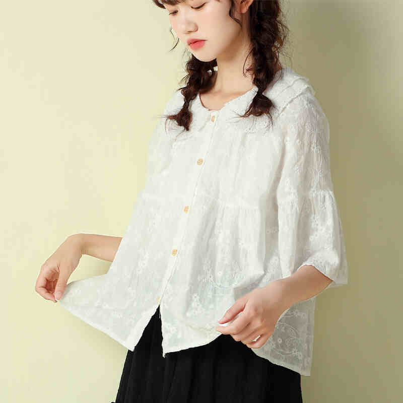 ▲韩系休闲慵懒风刺绣喇叭袖中袖开衫衬衫