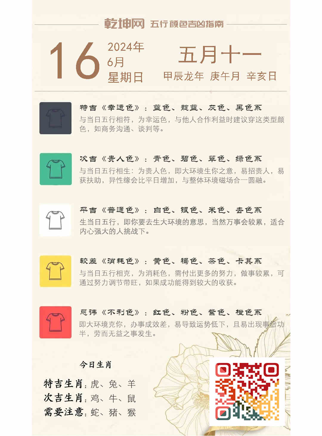 希望今天的五行穿衣颜色指南能给大家带来一些穿搭灵感,让我们在2024年6月16日穿出好运和好心情!如想了解更多五行穿衣的小知识,欢迎关注“乾坤网”。