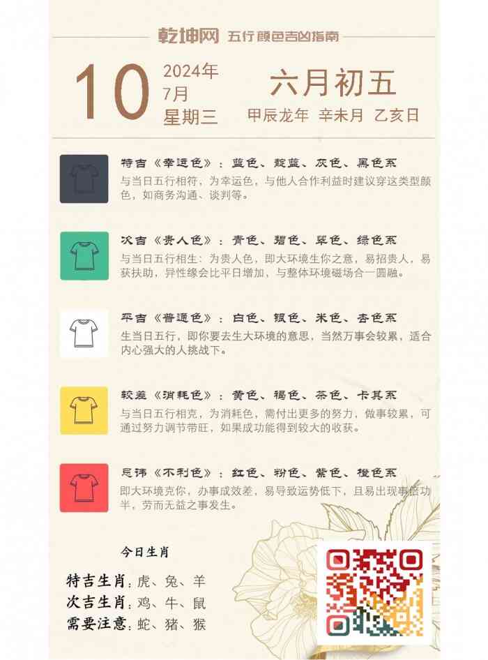 五行穿衣颜色指南:2024年7月10日幸运的五行穿衣颜色开运指导。任何人都有属于自己的幸运颜色,不相同的五行色穿搭,对大家的发展有着巨大的影响。根据当天的磁场来选择合适的吉利颜色,可以改变自身运气,从而让我们自己更加顺利。2024年7月10日五行穿衣颜色分享,请跟随小易一起看看吧!