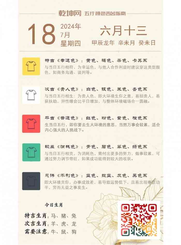 2024年7月18日幸运的五行穿衣颜色开运指导。每天幸运的五行穿衣颜色查看。穿衣搭配是日常生活中常常出现的事情,它不但会干扰着每一个人的美观和精神状况,还很有可能会让我们自己更加重视衣服的搭配风格和样式。2024年7月18日五行穿衣颜色参考,穿出好运来。