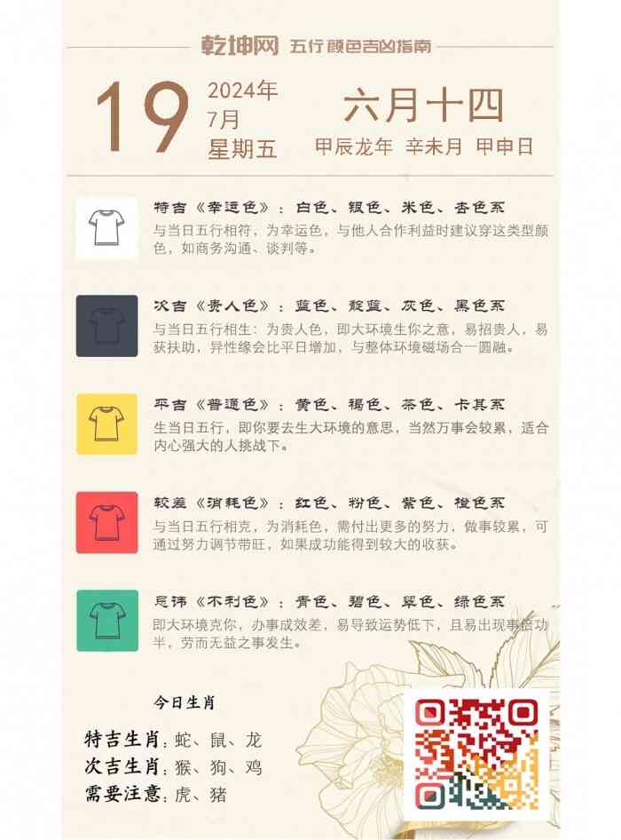 2024年7月19日五行穿衣颜色分析指导,今天应该穿什么类型的五行穿衣颜色?穿搭合适的衣服才能让一个人看起来十分干净和有精神,也能让人保持愉悦之感。因此大多数人都会去选择一个比较适合自己的幸运色来作为自己当天的穿衣搭配的颜色。这样不单单可以给人带来好运,还可以改善我们的气场,让自己每天都能有个好的心情。下面,请随小易一起来看看2024年7月19日五行穿衣颜色的内容吧。
