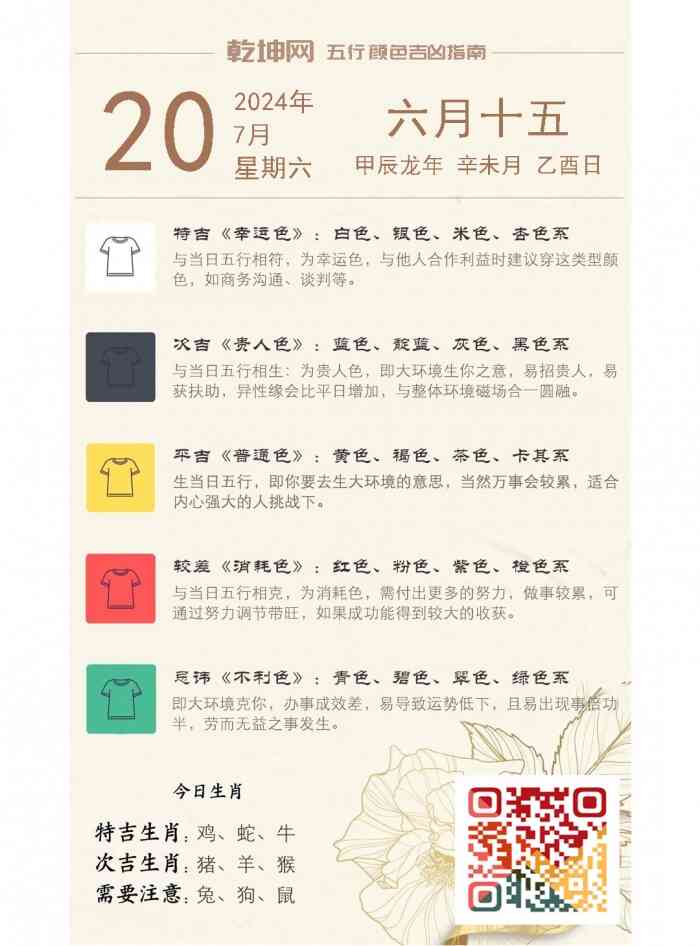 2024年7月20日五行穿衣颜色开运指导,2024年7月20日五行穿衣颜色有什么讲究。穿衣颜色搭配是一种选择最为幸运的五行色彩的方法,因为每一天不同的五行相生的颜色不相同,所以要注意穿搭正确的衣服来给自己提升好的运气。下面,我们就来看看2024年7月20日五行穿衣颜色指南。