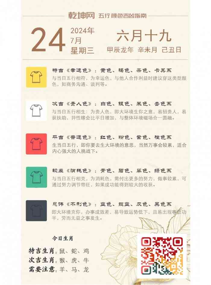 2024年7月24日五行穿衣颜色开运指导,想知道穿什么五行穿衣颜色可以带来好运吗?当前很多人在穿衣上花了大量的时间,事实上他们仅仅考虑的是颜色和自身的爱好般配而已。如果可以挑选适合自己五行属性之色进行穿搭,就能让我们自己的运势变得更好、更顺畅。下面,小易带大家一起看看2024年7月24日什么是幸运的五行穿衣颜色。