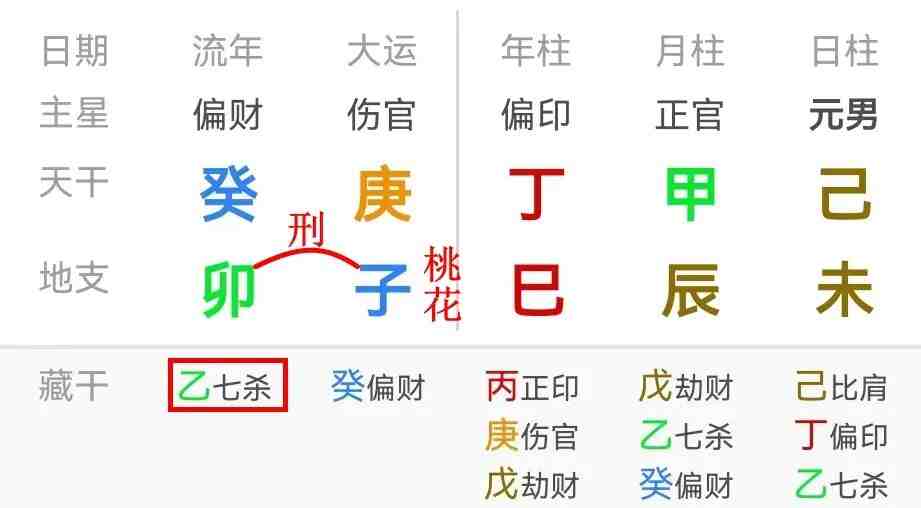 桃花带刑,说明桃花会让他面临刑事诉讼。卯木又是七杀,七杀是偏官,也代表了官司诉讼。