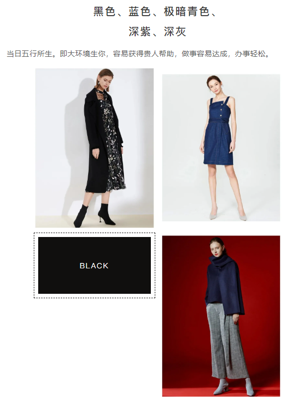 吉吉吉:穿蓝色. 黑色. 灰色等相近色,与当日五行相生,为贵人色,大环境助你,易招贵人,易获扶助,办事易成。
