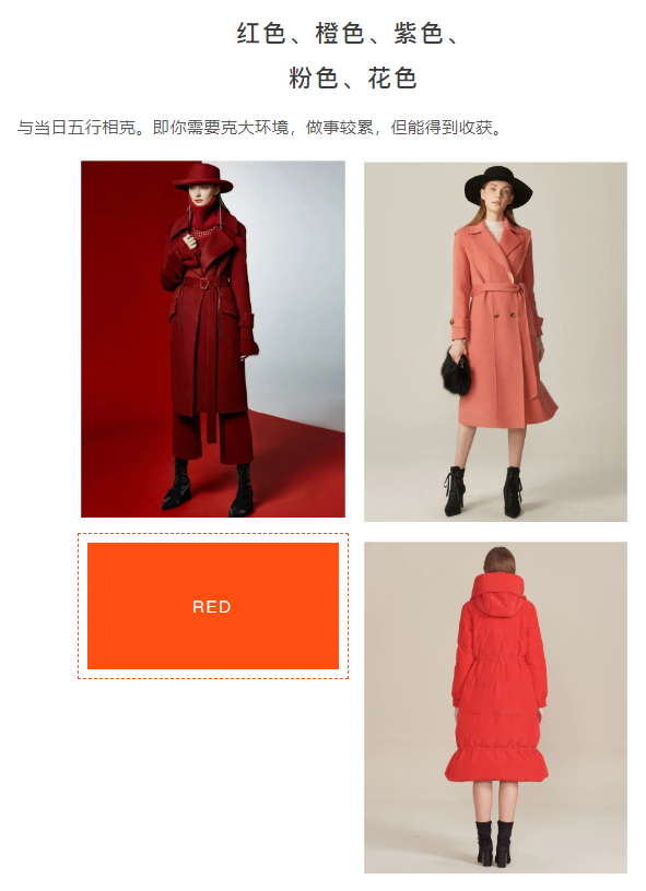 吉:穿红色. 粉色. 紫色等相近色,与当日五行相克,克者为财,做事较累,需更加努力,通过自己努力调节带旺,能得到收获。