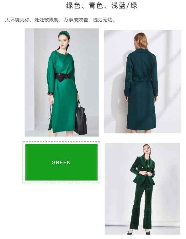 不推荐:穿绿色. 青色. 碧色相近色,(金克木)不利色,大环境克你,万事成效差。