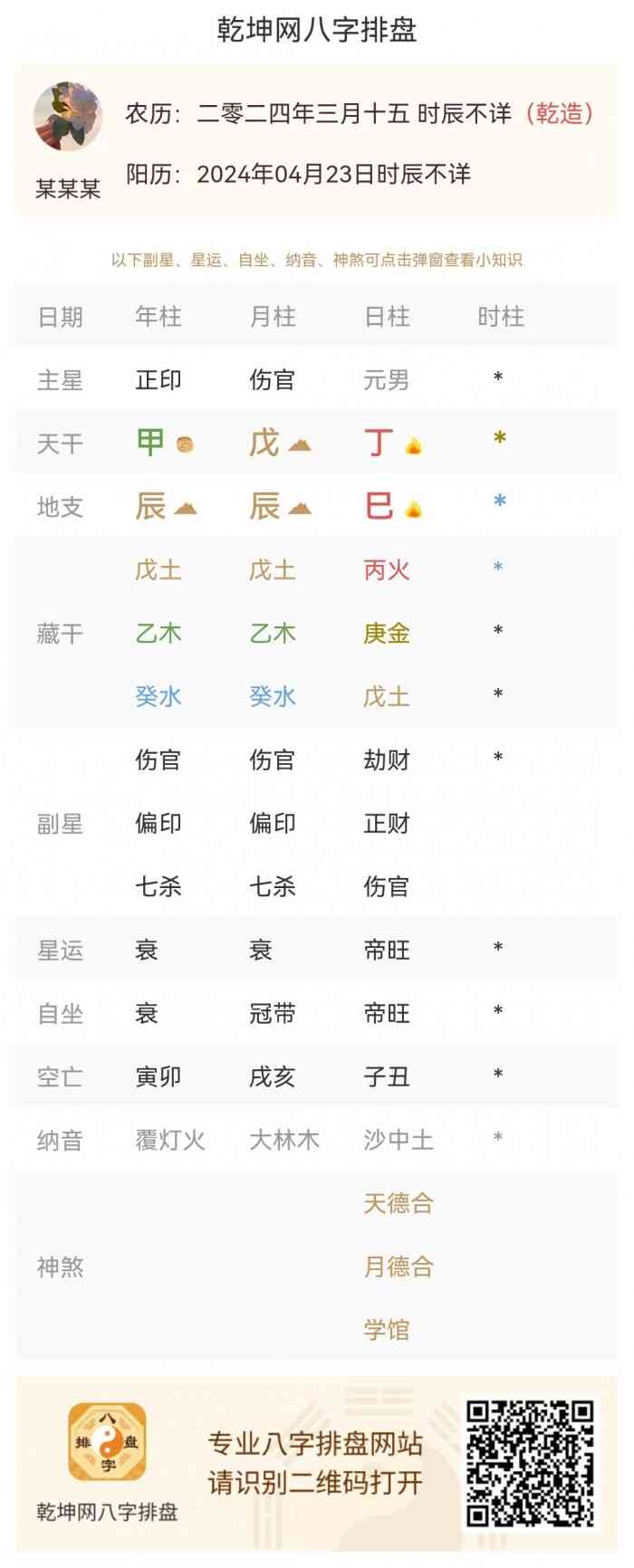 2024年4月23日出生的人八字为:甲辰 戊辰 丁巳,日元是丁,五行属火,缘主是火命或丁火命;