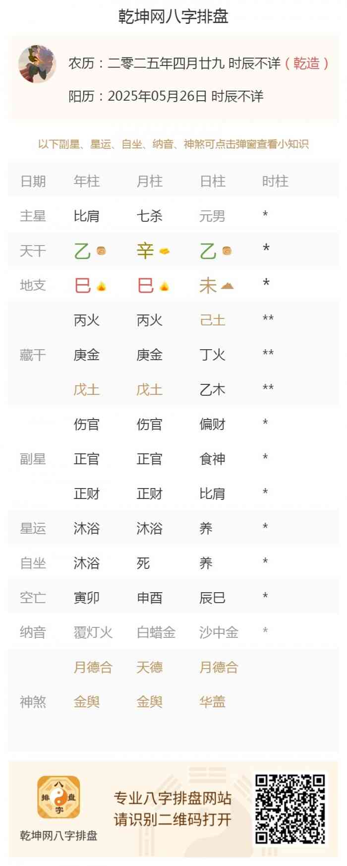 2025年5月26日出生的人八字为:乙巳 辛巳 乙未,日元是乙,五行属木,缘主是木命或乙木命;