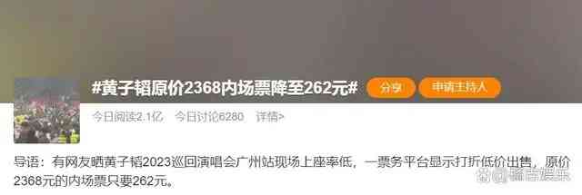 近日,有网友爆料称,黄子韬的巡回演唱会广州站2368元的内场票竟然降至262元。这一消息迅速引发了广泛关注和热议,许多粉丝和网友都表示非常惊讶和欣喜。