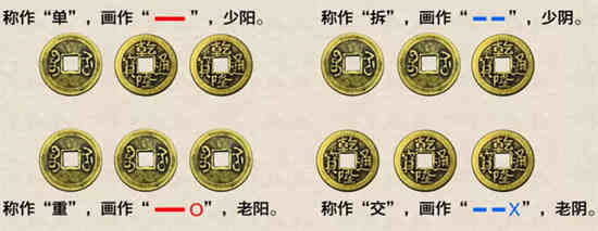 选用现代钱币起卦,须明确何为“阳”面,何为“阴”面,不能单凭自己的主观观点与喜好来臆定,六次抛线,由下至上记录,排卦方式如下: