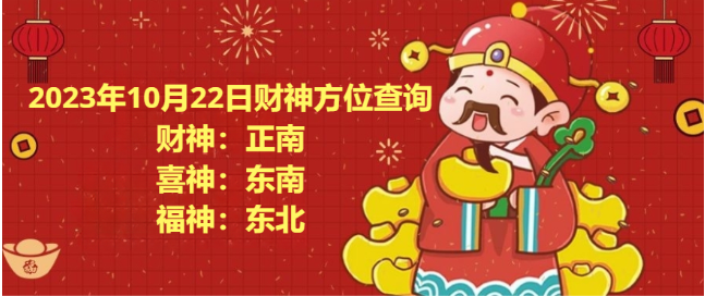 经上文黄历查询,2023年10月22日财神方位是在正南方向哦,那么10月22日各时辰的财神喜神方位在哪里呢?