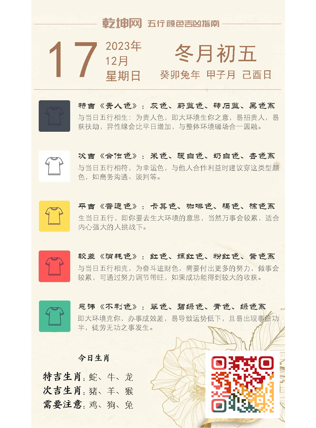 农历:二零二三年 十一月初五,2023年12月17日 星期日,建星:收日,喜神:东北,福神:正北,财神:正北