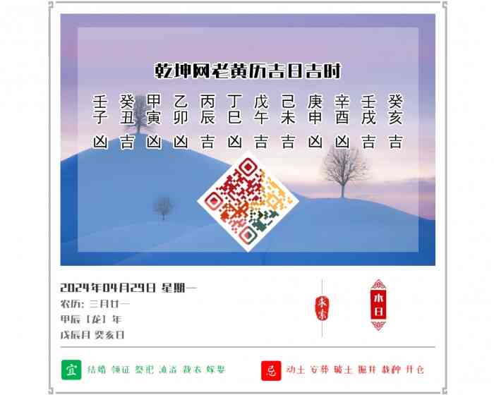 2024年4月29日老黄历查询,今天老黄历上是黄道吉日吗?我们对自己人生中的大多数事情都是十分看重的,这对于自己的人生十分关键。在做这些事情之时,许多人都会对时间进行选择,希望能选择在大吉大利的黄道吉日当中进行。下面,我们就来看一看老黄历的详细内容吧。