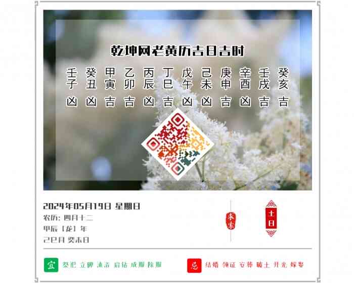 2024年5月19日老黄历查询,2024年5月19日老黄历是黄道吉日吗?选择一个黄道吉日办事,可以趋吉避凶,增加事情成功的概率。在办大事之前都会通过老黄历选一个黄道吉日,然后再安排办理待办事项,在好运的加持下,能心想事成,事情办得顺顺利利。下面,我们就来看一看老黄历的详细内容吧