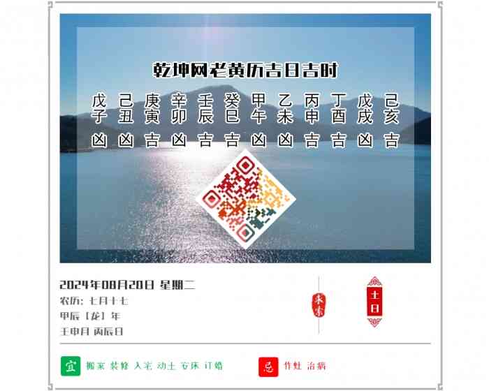 2024年8月20日老黄历择日查询,2024年8月20日老黄历上今天是黄道吉日吗?希望今天的择日查询指南能为大家带来更多好运与顺遂,让我们都能感受到一丝丝宁静与美好。下面,我们就来看一看老黄历的详细内容吧。