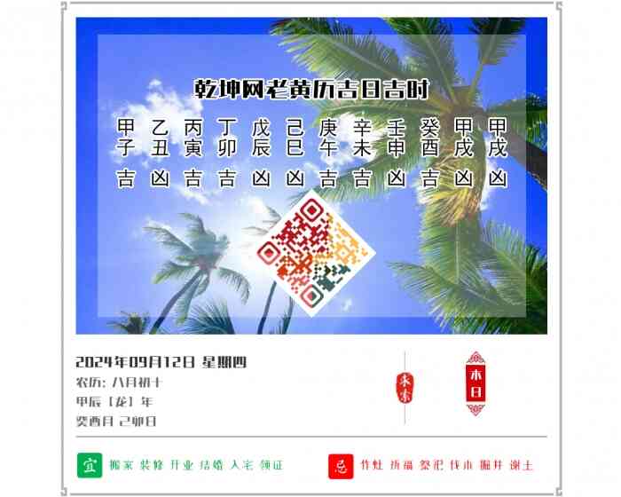老黄历提醒:今天是公历2024年9月12日,农历八月初十,干支为甲辰癸酉己卯,当天吉神明堂值日,是一个黄道吉日。在择日上优先选择【宜】做之事,但凡适合的用事在这天举行则能顺风顺水。