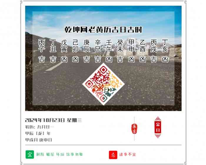 老黄历提醒:今天是公历2024年10月23日,农历九月廿一,干支为甲辰甲戌庚申,当天吉神金匮值日,是一个黄道吉日。在择日上优先选择【宜】做之事,但凡适合的用事在这天举行则能顺风顺水。