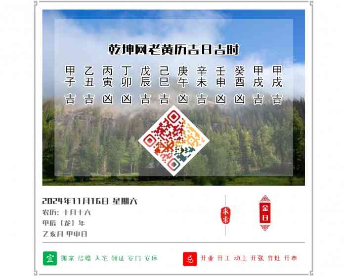 2024年11月16日老黄历择日查询,2024年11月16日老黄历上今天是黄道吉日吗?通过关注和查看老黄历,我们就能选择到一个吉利的日子来进行待办的活动,以期待获得更好的结果。下面,我们就来看一看老黄历的详细内容吧。