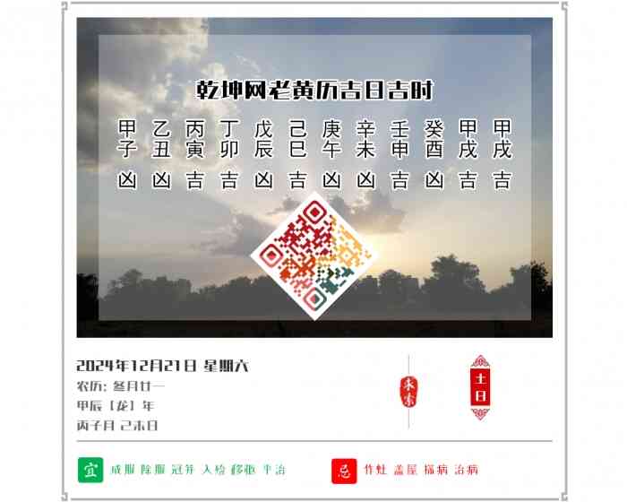 2024年12月21日老黄历择日查询,2024年12月21日老黄历上今天是黄道吉日吗?老黄历上的二十四节气也是传统节日和文化活动的载体,如春节、清明、端午、中秋等,都与之密切相关。下面,我们就来看一看老黄历的详细内容吧。