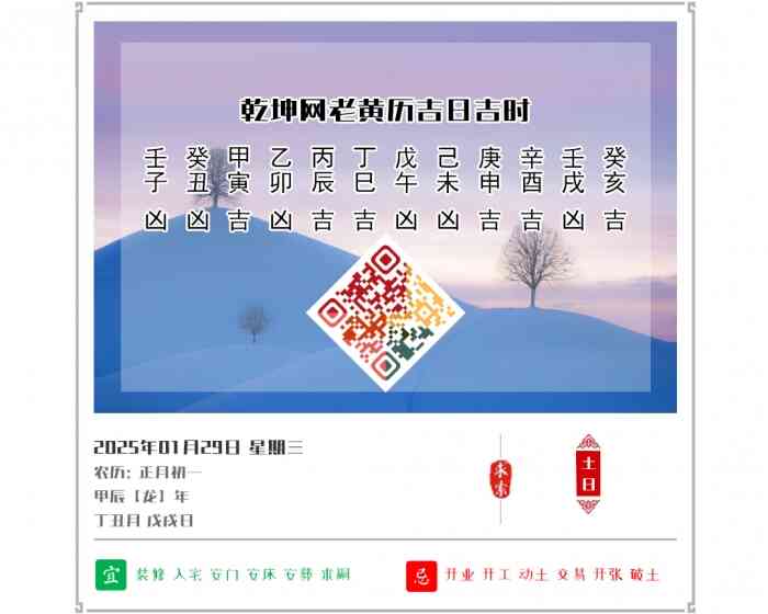 老黄历提醒:今天是公历2025年1月29日,农历正月初一,干支为甲辰丁丑戊戌,当天吉神青龙值日,是一个黄道吉日。在择日上优先选择【宜】做之事,但凡适合的用事在这天举行则能顺风顺水。