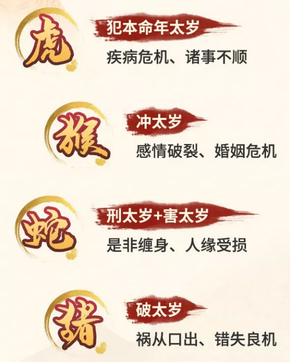 而2022壬寅虎年犯太岁的生肖分别是:虎、猴、蛇、猪。